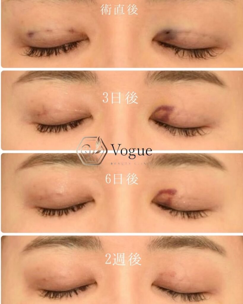 個人差はありますが、術後2週間程かけて目立つ腫れや内出血が落ち着いていきます。
